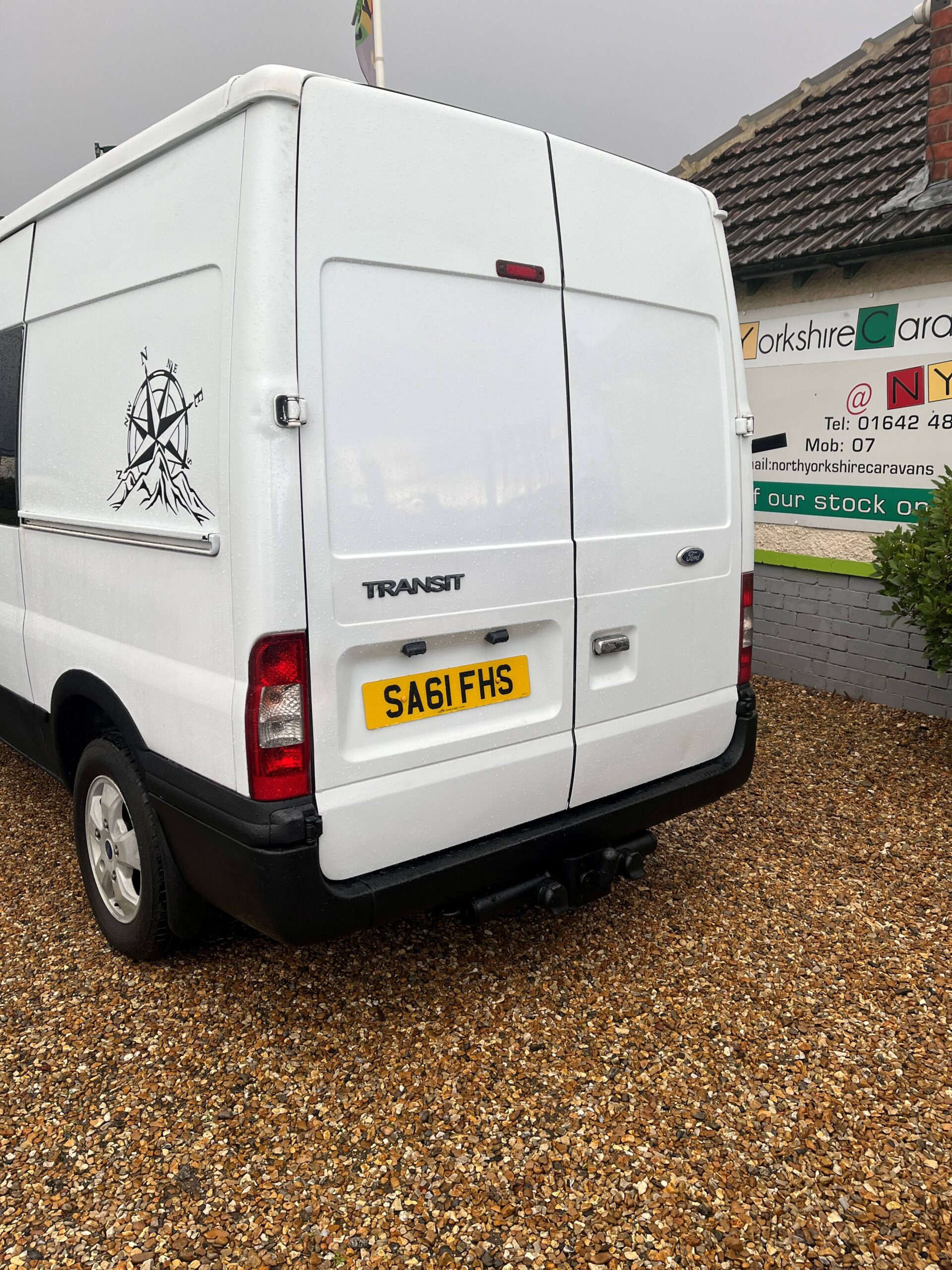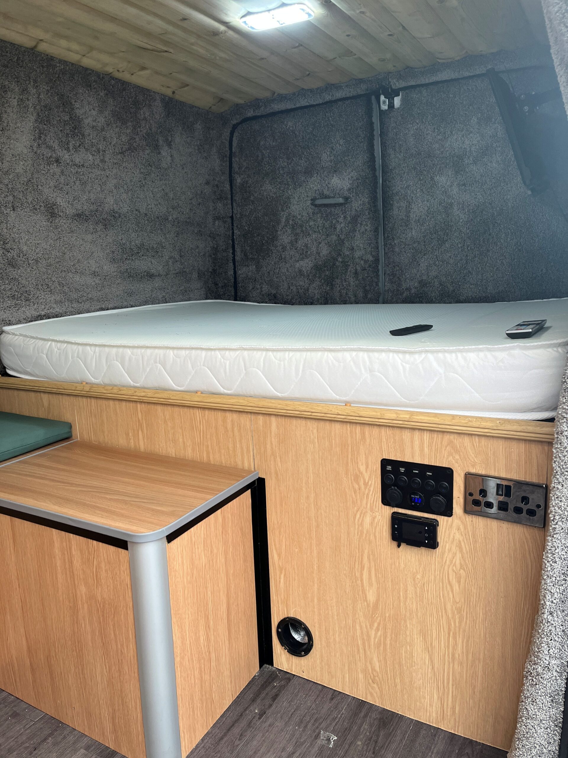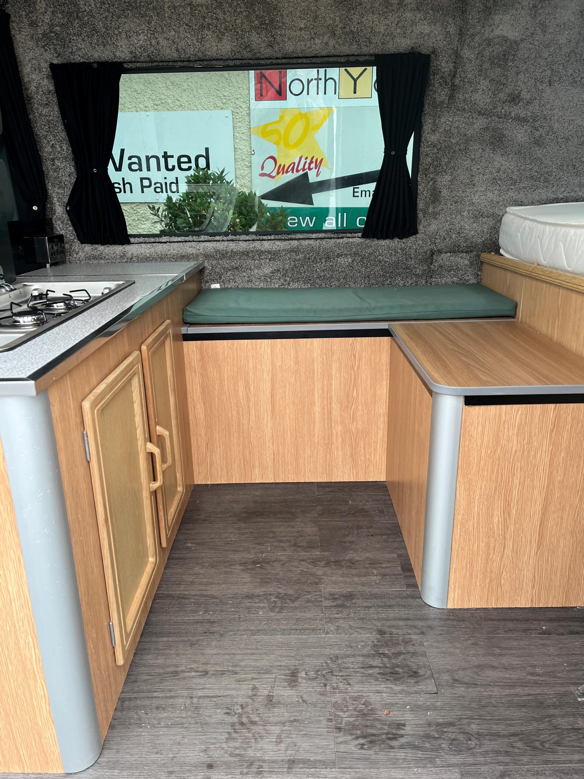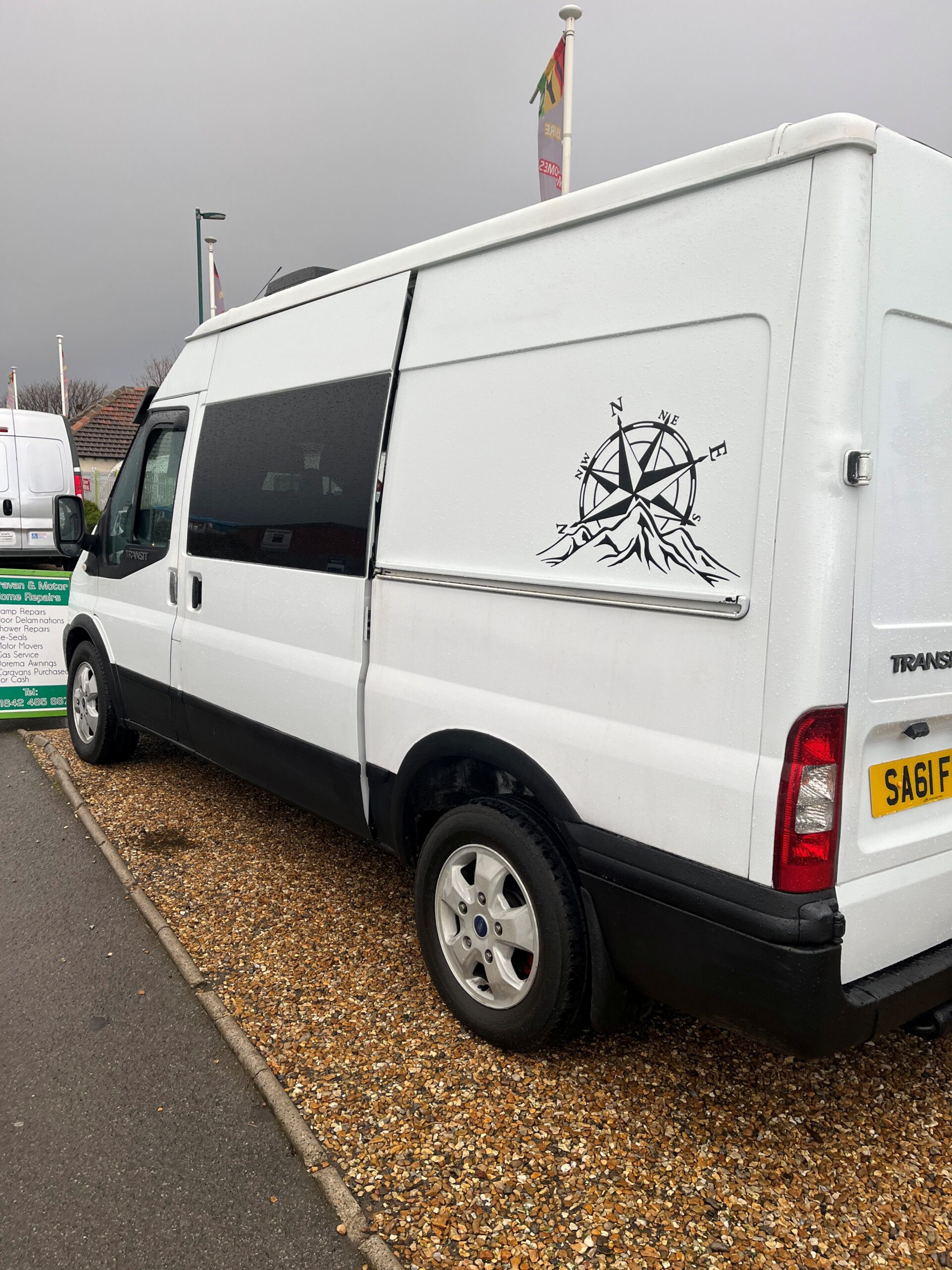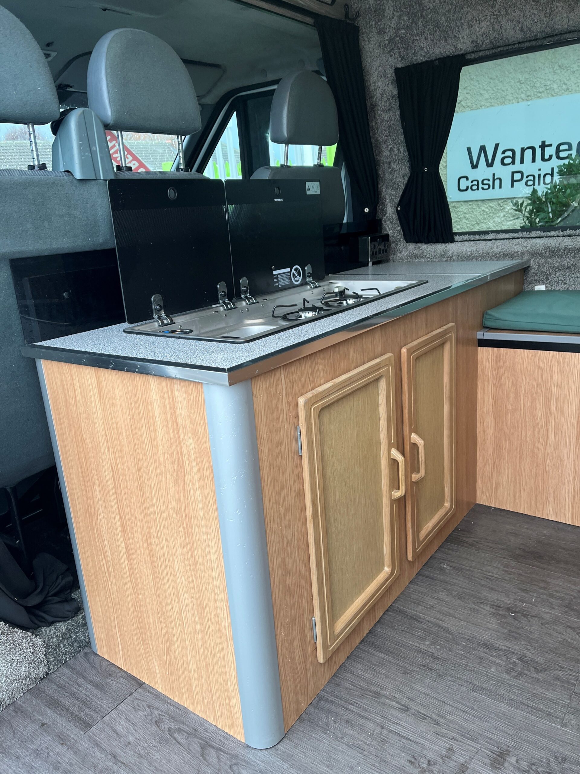 2011 Ford Transit Trend FWD 2.2 with 3 front seats, rear fixed double bed with TV above & storage below, side kitchen area with twin gas hob & sink, seating for 2 people, diesel heater, bottle cooler, solar panel